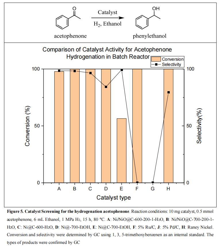 成功開發了高效的磁性石墨烯包裹薄層 Ni@C 催化劑,該催化劑對苯乙酮加氫制備苯乙醇具有高催化活性,并成功應用于流動反應器中,表現出優異的轉化率和選擇性。