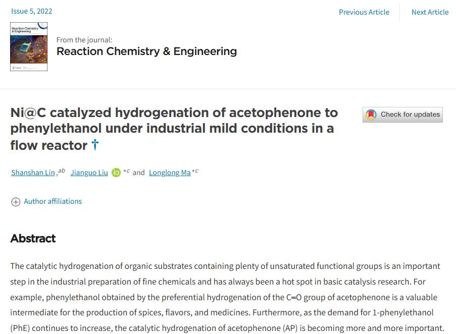 2022年發表于《Reaction Chemistry & Engineering》的文獻《Ni@C Catalyzed Hydrogenation of Acetophenone to Phenylethanol under Industrial Mild Conditions in a Flow Reactor》,對非貴金屬鎳負載石墨烯基催化劑(Ni@C)在流動反應器中高效催化苯乙酮加氫制備苯乙醇進行了研究。研究中使用的流動反應器由歐世盛公司提供。