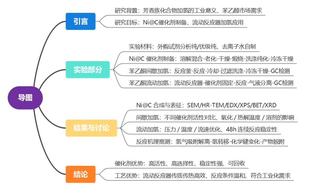 將非貴金屬鎳負載石墨烯基催化劑(Ni@C)應用于流動反應器催化苯乙酮加氫,兼具低成本和高效率。催化劑磁性設計適配流動體系,解決了固體催化劑堵塞和分離難題。