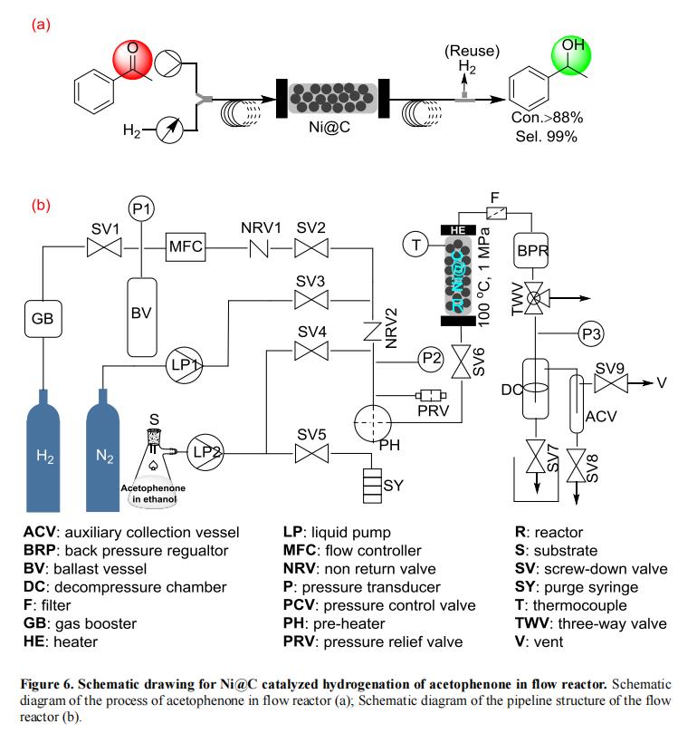 圖 6. Ni@C 催化流動反應器中苯乙酮加氫的示意圖:(a)苯乙酮在流動反應器中的反應流程示意圖;(b)流動反應器的管路結構示意圖