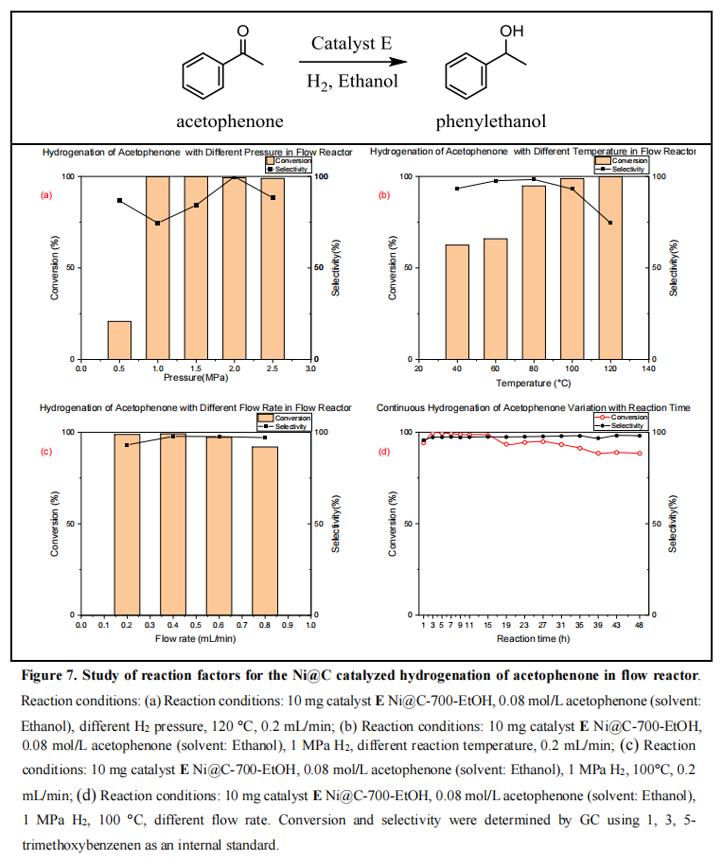 圖 7. 流動反應器中 Ni@C 催化苯乙酮加氫的反應因素研究