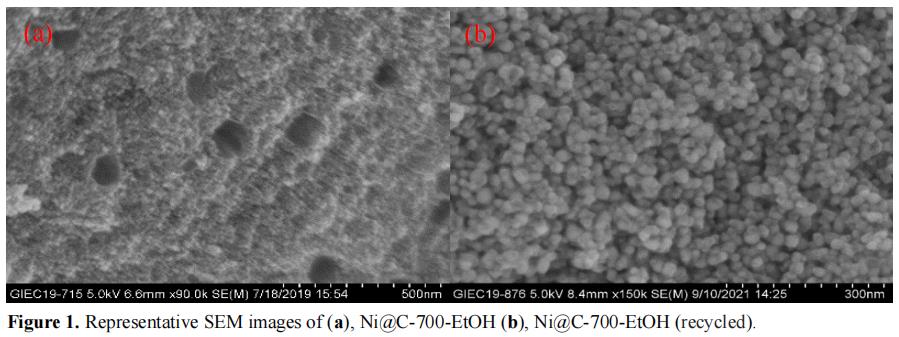圖 1. Ni@C-700-EtOH(a)和 Ni@C-700-EtOH(回收后)(b)的代表性掃描電子顯微鏡(SEM)圖像